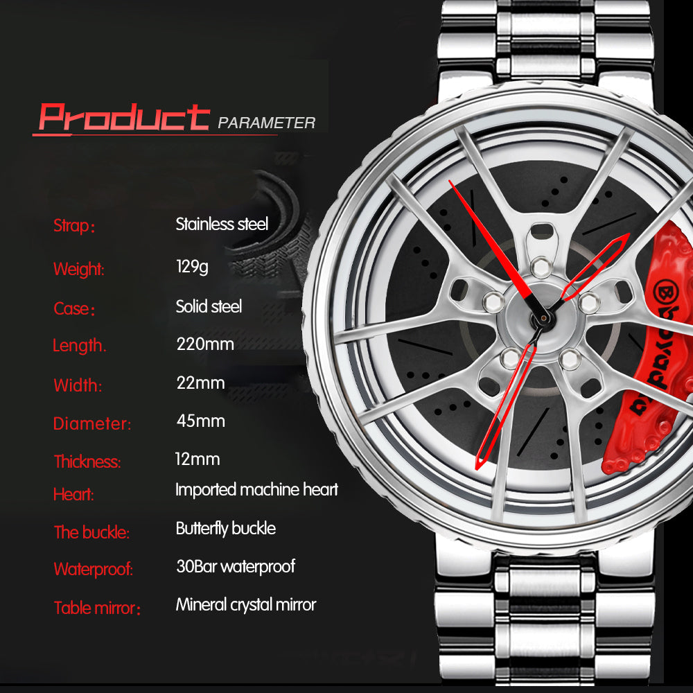 Car Wheel Watch-Waterproof Stainless Steel Japanese Quartz Wrist Watch