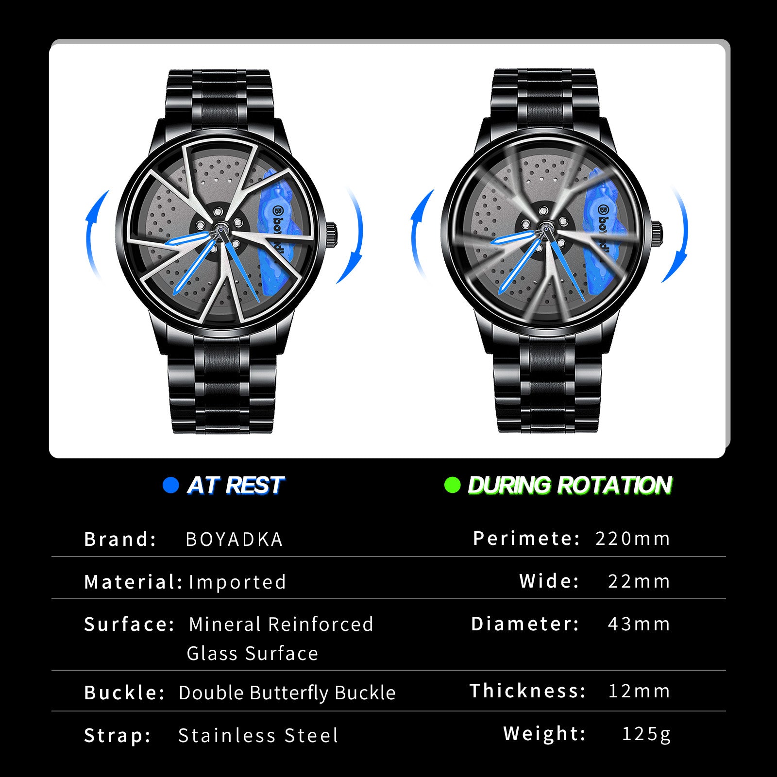 【Spinning by flick your Wrist】: We inspired by high-end sports car wheel rim and sport brake caliper shape, hollow dial design ingeniously combined racing car elements and watch elements, perfectly demonstrated the beauty of machinery. Nice gift for men/boy!